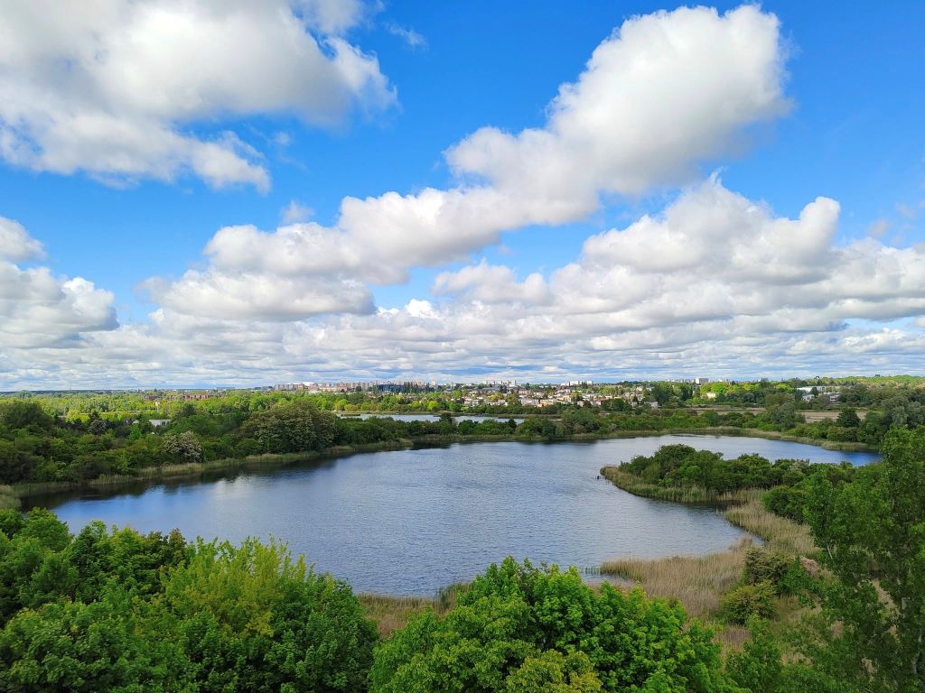 widoki: pobliskie stawy, zabudowania Poznania