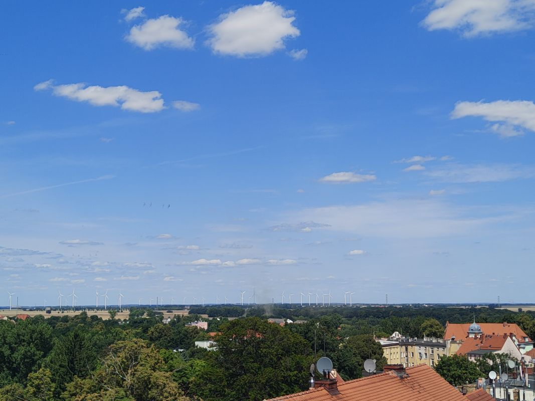 widoki: zabudowania Złotoryi, Wilcza Góra, Karkonosze, pobliskie wiatraki
