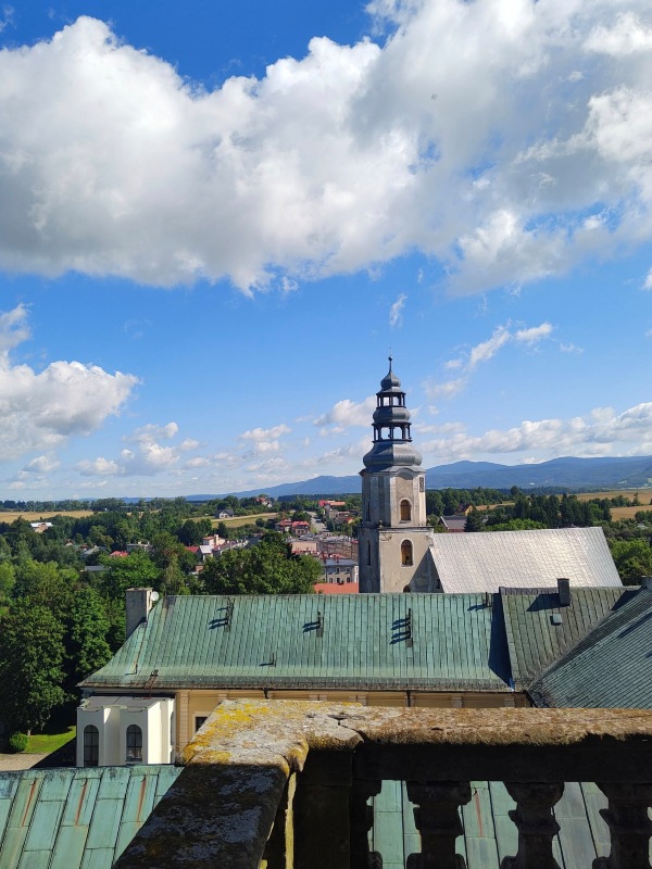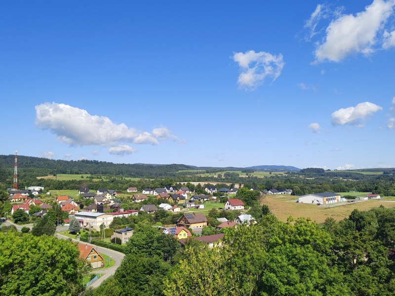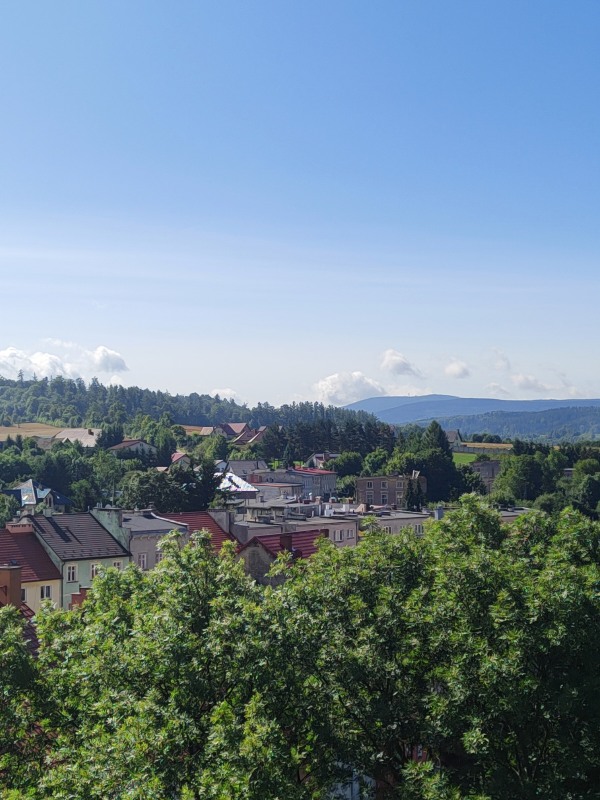widoki: zabudowania Międzylesia, Masyw Śnieżnika, Góry Bystrzyckie, Góry Orlickie