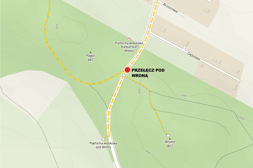 Początek naszego wypadu, który nie będzie należał do tych najtrudniejszych, ulokowaliśmy na poboczu drogi biegnącej w okolicy Przełęczy pod Wroną. Odnajdziecie ją nad Myśliszowem, niedaleko Bielawy.