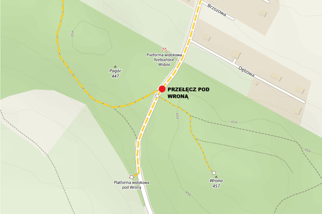 Trasa, która zaprowadzi nas do niej zaczyna się dokładnie przy tabliczce z napisem „Przełęcz pod Wroną”. W całości wiedzie ona według oznaczeń żółtego koloru, nie jest przesadnie wymagająca i w zaledwie kilku miejscach wymaga koncentracji, tak aby nie przeoczyć właściwego skrętu.