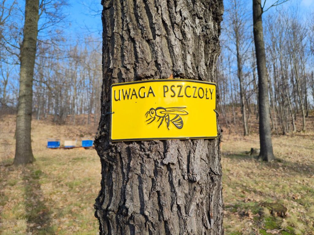 Oznaką, że podążamy we właściwym kierunku są pojawiające się przy naszej ścieżce ule i ostrzeżenie przed latającymi owadami.