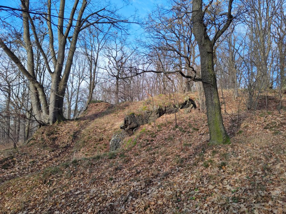 Przy naszym szlaku zaczynają pojawiać się skałki. Ścieżka prowadzi obok nich. Mijamy także niewielką skalną jamę.
