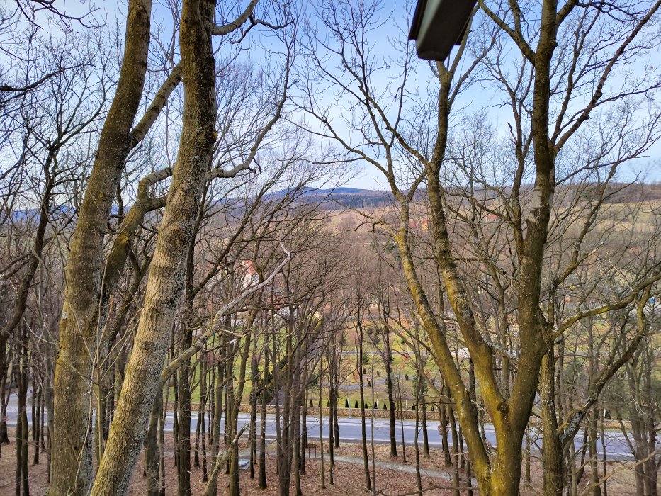 widoki: niestety drzewa rosnące w parku, przy którym znajduje się wieża skutecznie zasłaniają niemal cały krajobraz widoczny z jej tarasu widokowego