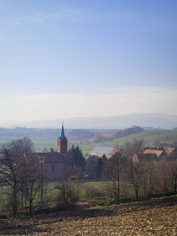 Być może nie warto przyjeżdzać tu specjalnie dla krajobrazów, ale jeśli akurat będziecie w okolicy, polecamy zatrzymać się na poboczu i zrobić sobie krótki spacer nagrodzony widokiem na zabudowania miejscowości, fragment Gór Złotych oraz Góry Bardzkie.
